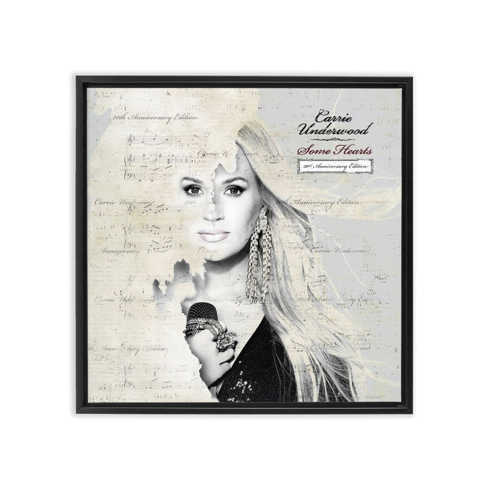 Framed canvas of Carrie Underwood with music note artwork for Some Hearts 20th Anniversary. Available in 6 sizes.
