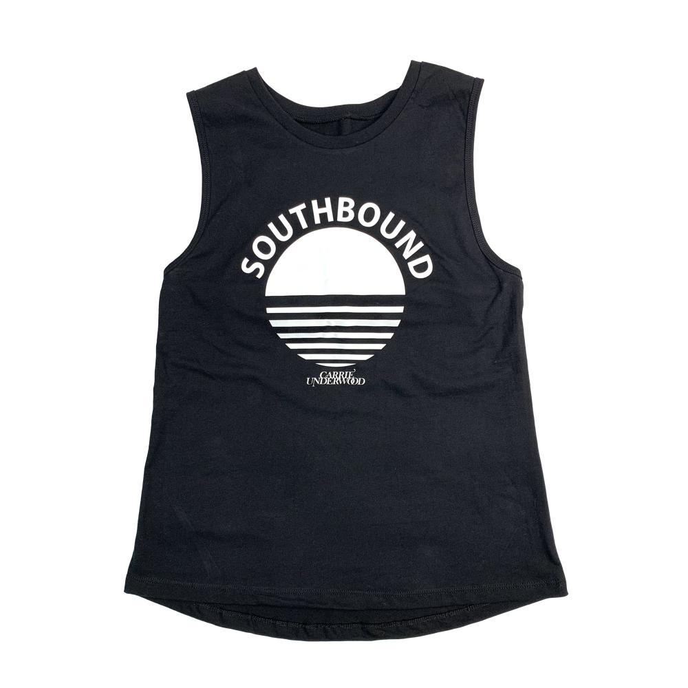 Black feminine fit tank top with "Southbound" sunset graphic in white.
